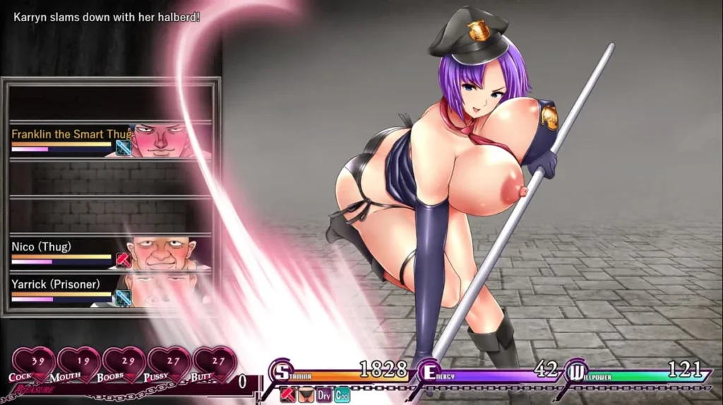 But the true core of the Karryn’s Prison gameplay is interaction. You will spend a significant amount of time in one-on-one encounters with inmates and other characters. Here, the game seamlessly shifts into its visual novel/RPG hybrid mode. Conversations are not just fluff; they are tactical engagements. You have a stamina resource representing your focus and willpower. Different dialogue and action choices cost stamina.